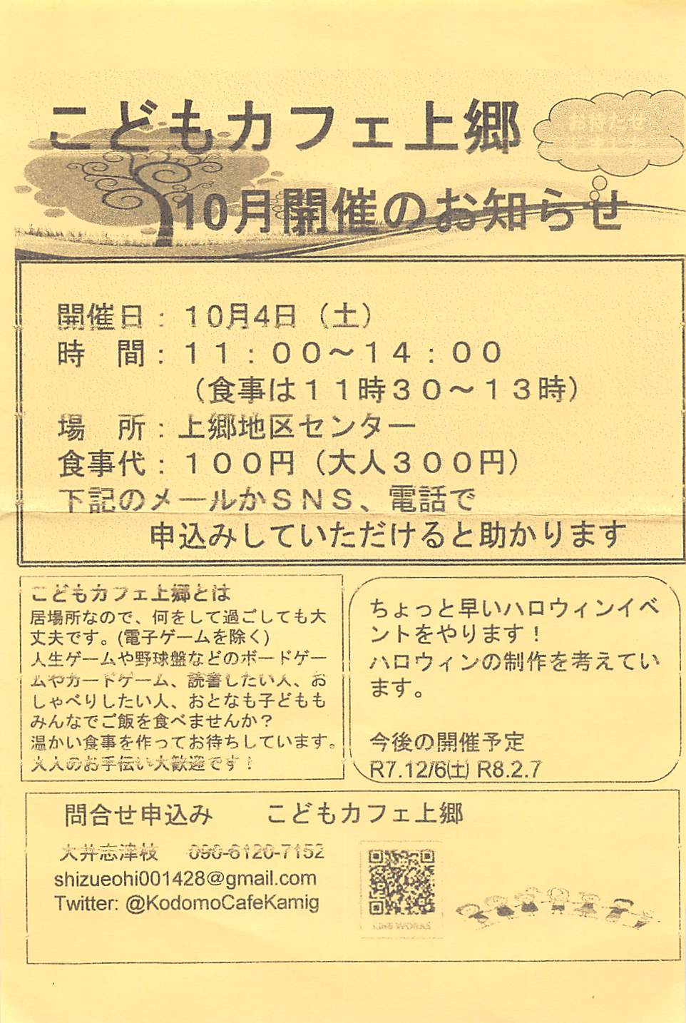 - 9月民児協定例会よりお知らせ:「こどもカフェ上郷開催のお知らせ」- こどもカフェ上郷10月開催のお知らせ 開催日:10月4日(土)時間:11:00~…