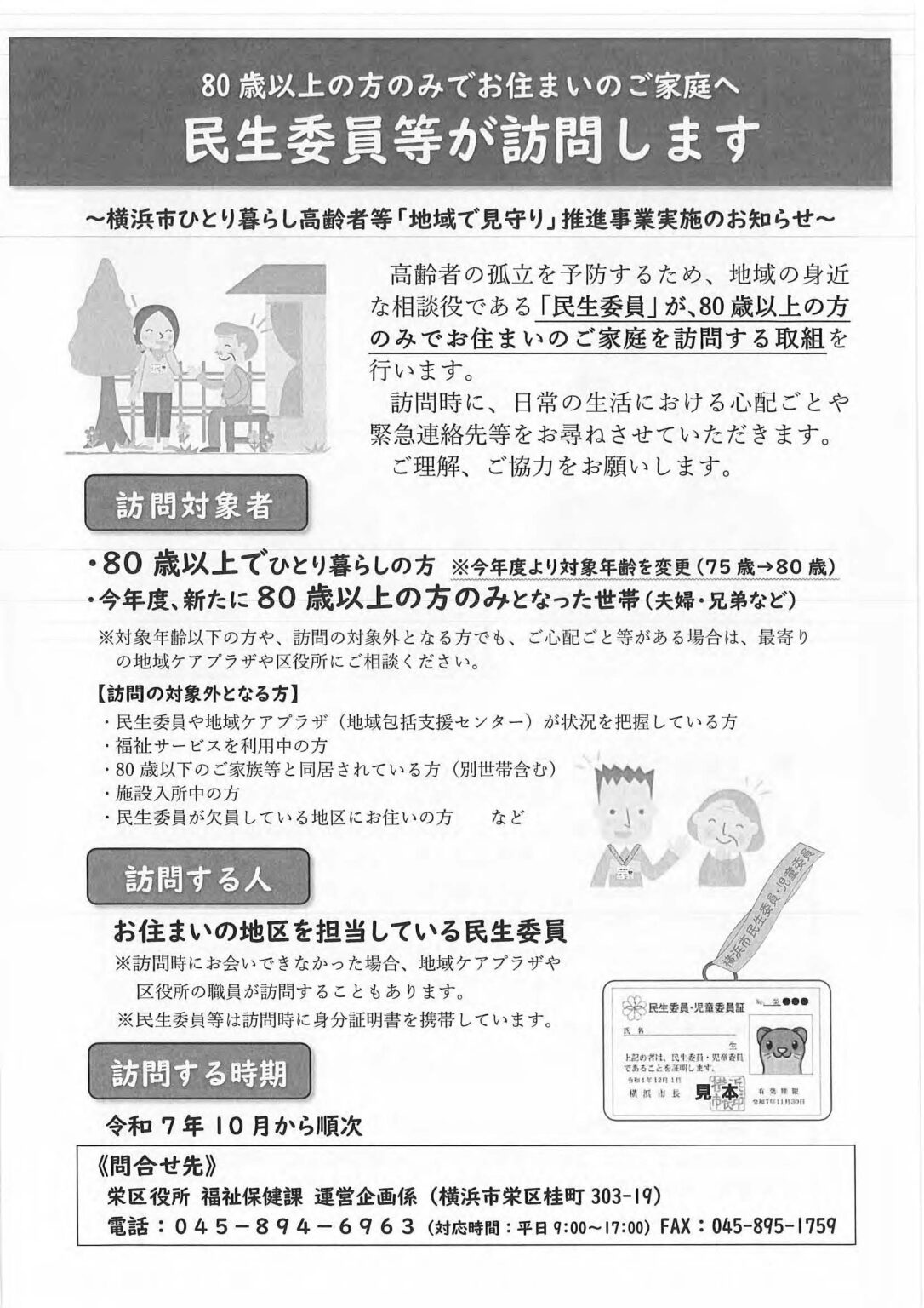 - 9月民児協定例会よりお知らせ:「民生委員等が訪問します~地域で見守り推進 事業実施のお知らせ~」- 民生委員等が訪問します~地域で見守り推進 事業実施のお知らせ~ 80歳以上の方の…