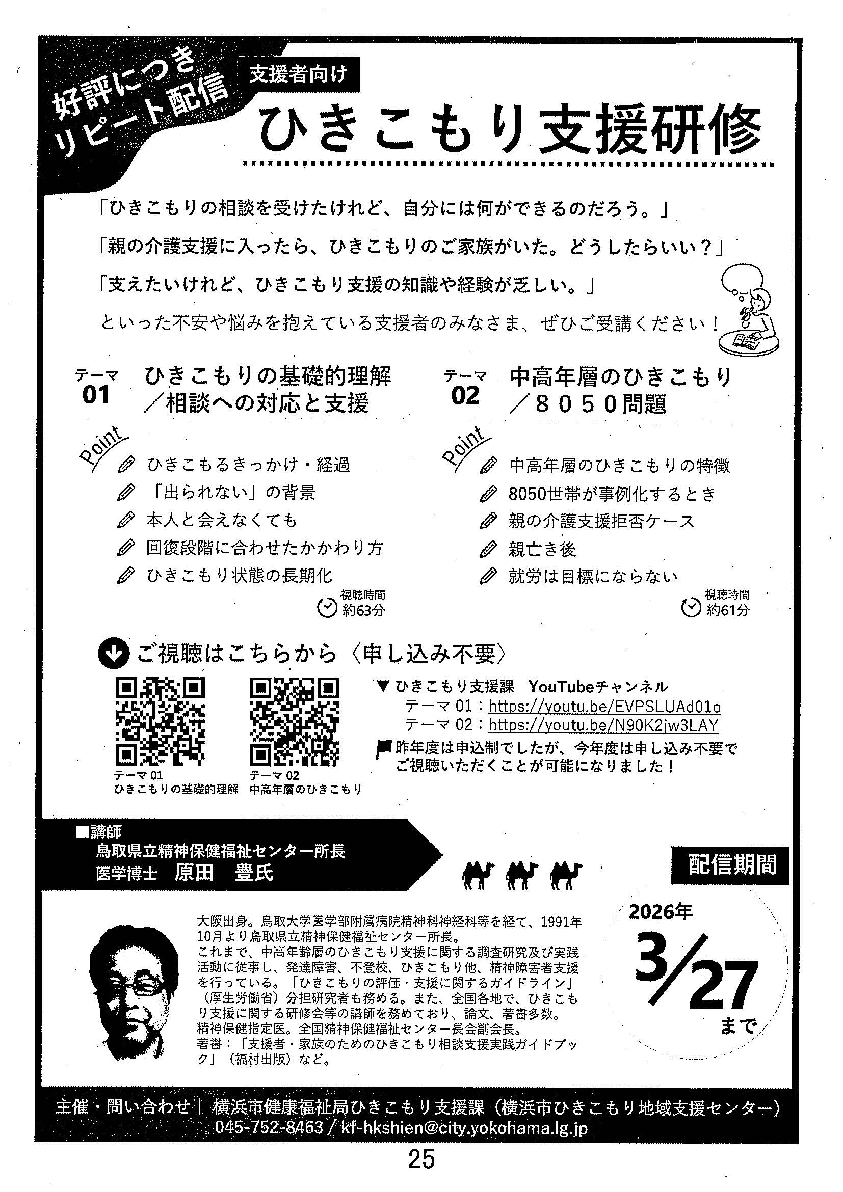 - 9月民児協定例会よりお知らせ:「支援者むけ ひきこもり支援研修」- 横浜市 「支援者むけ ひきこもり支援研修」 ひきこもりの理解促進のために、支援者…