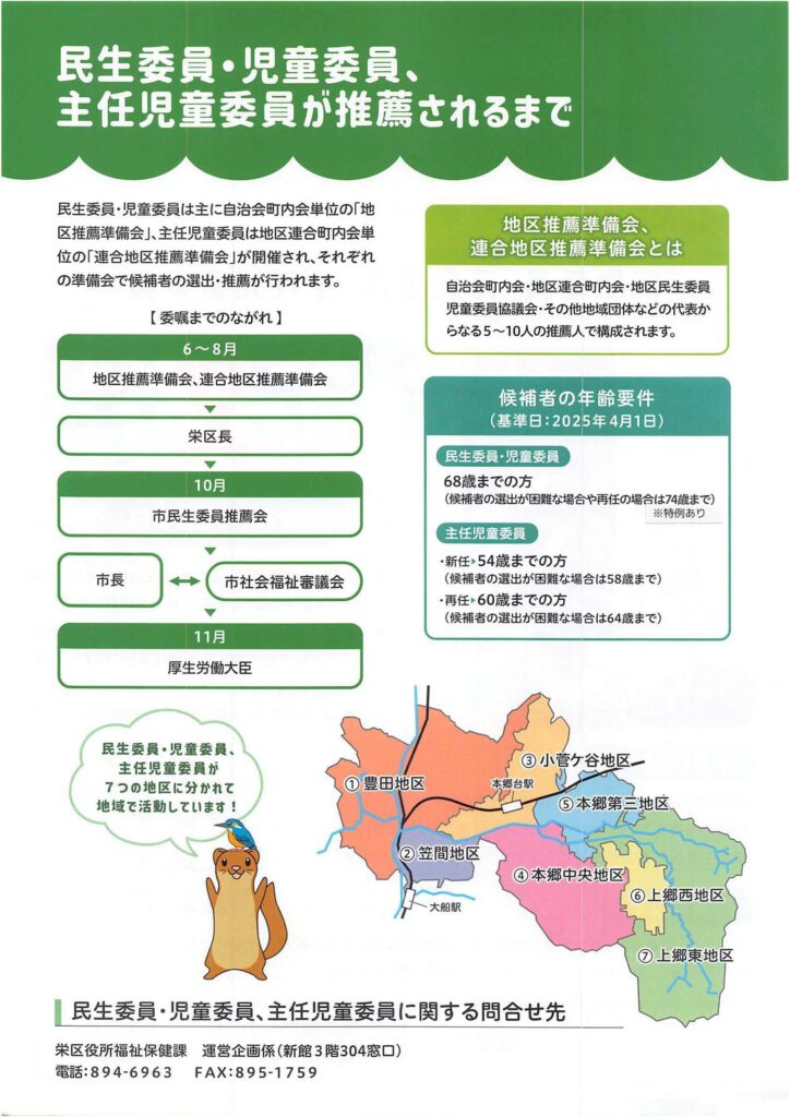 民生委員は、民生委員法に基づき、厚生労働大臣から委嘱された非常勤特別職(無報酬)の地方公務員です。民生委員は、児童福祉法に定める児童委員を兼ねており、そのうち、主任児童委員は、児童福祉に関することを専門的に担当しています。