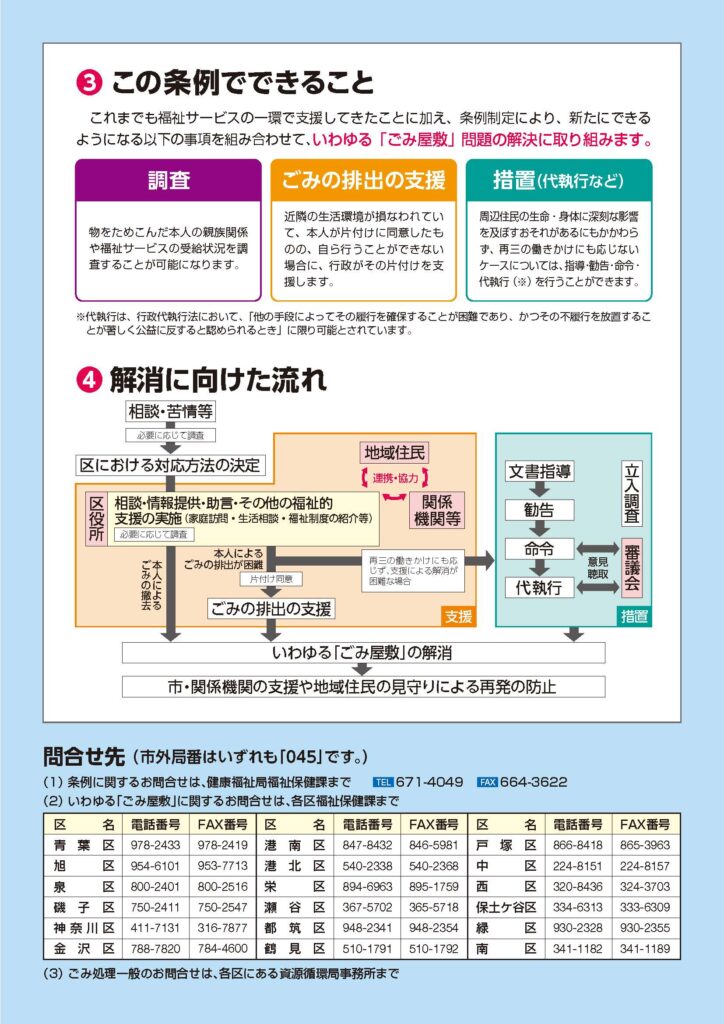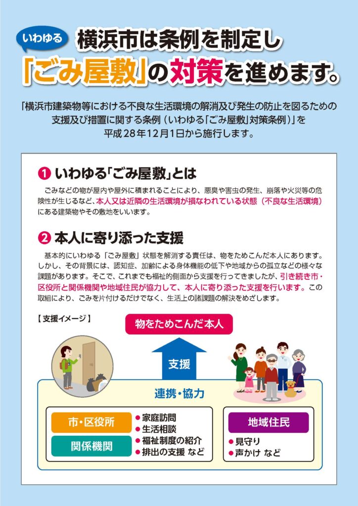 横浜市では、ごみなどによる「不良な生活環境」の解消・発生防止を図るため、「横浜市建築物等における不良な生活環境の解消及び発生の防止を図るための支援及び措置に関する条例(いわゆる「ごみ屋敷」対策条例)」を平成28年12月1日から施行し、取組を進めています。