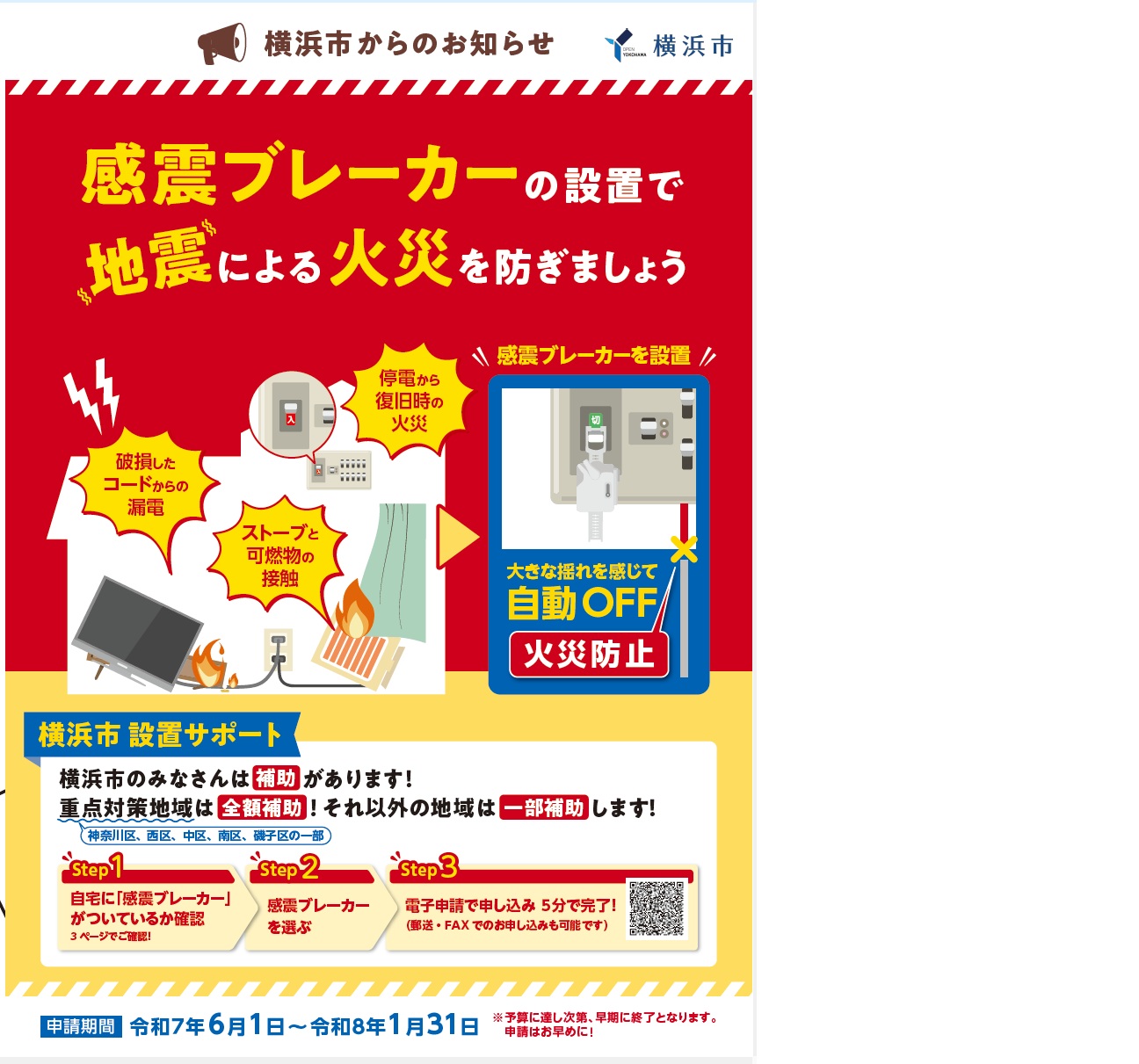横浜市 よこはま防災力向上事業 横浜市 「感震ブレーカー」を設置し、地震による火…