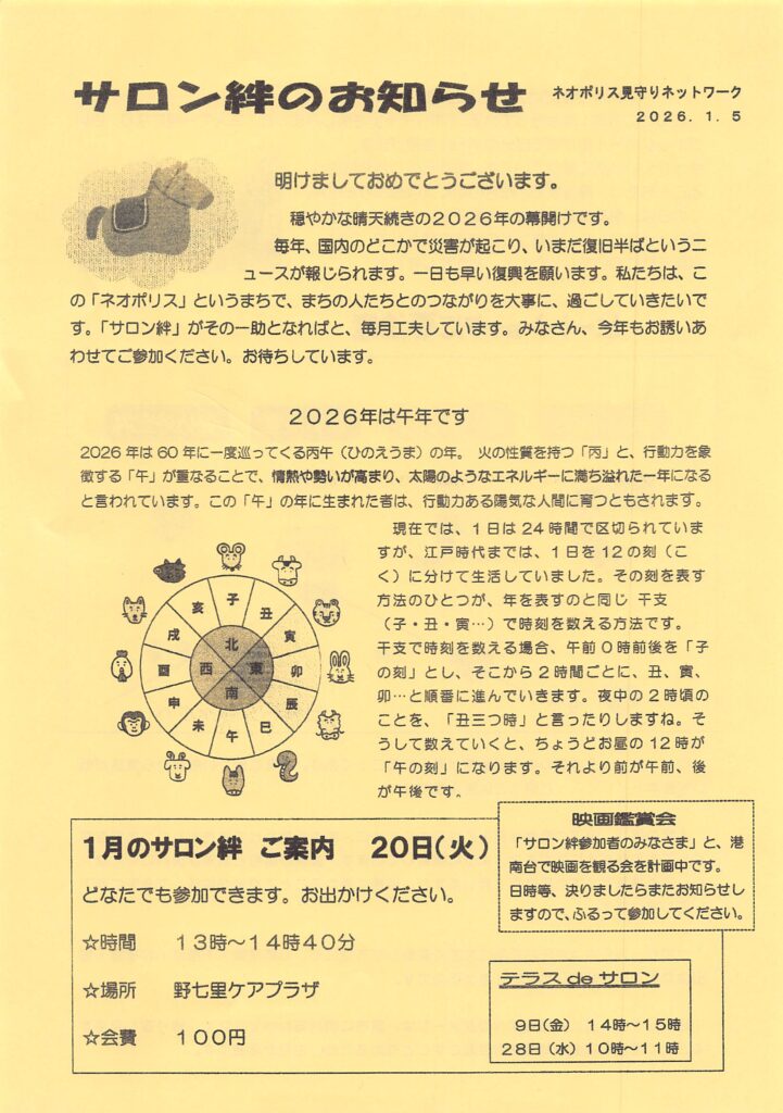 「サロン絆参加者のみなさま」と、港南台で映画を観る会を計画中です。日程等、決りましたらまたお知らせしますので、ふるって参加してください。