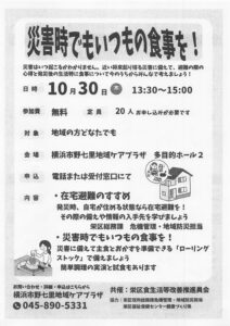 災害はいつ起こるかわかりません。近い将来起こり得る災害に備えて、避難の際の心得と発災後の生活特に食事について今のうちから考えましょう! 日時:2025年10月30日(木) 13:30~15:00参加費:無料 定員:20人 […]