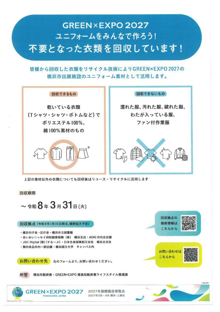 横浜市 市民の皆様の服が「GREEN×EXPO 2027」横浜市出展施設のスタッフユニフォームに生まれ変わります!