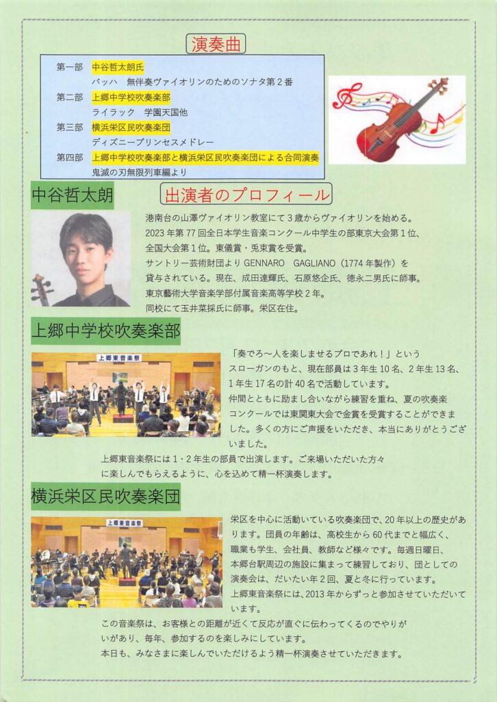 今年度も上郷中学校吹奏楽部、および栄区吹奏楽団による演奏を行います。