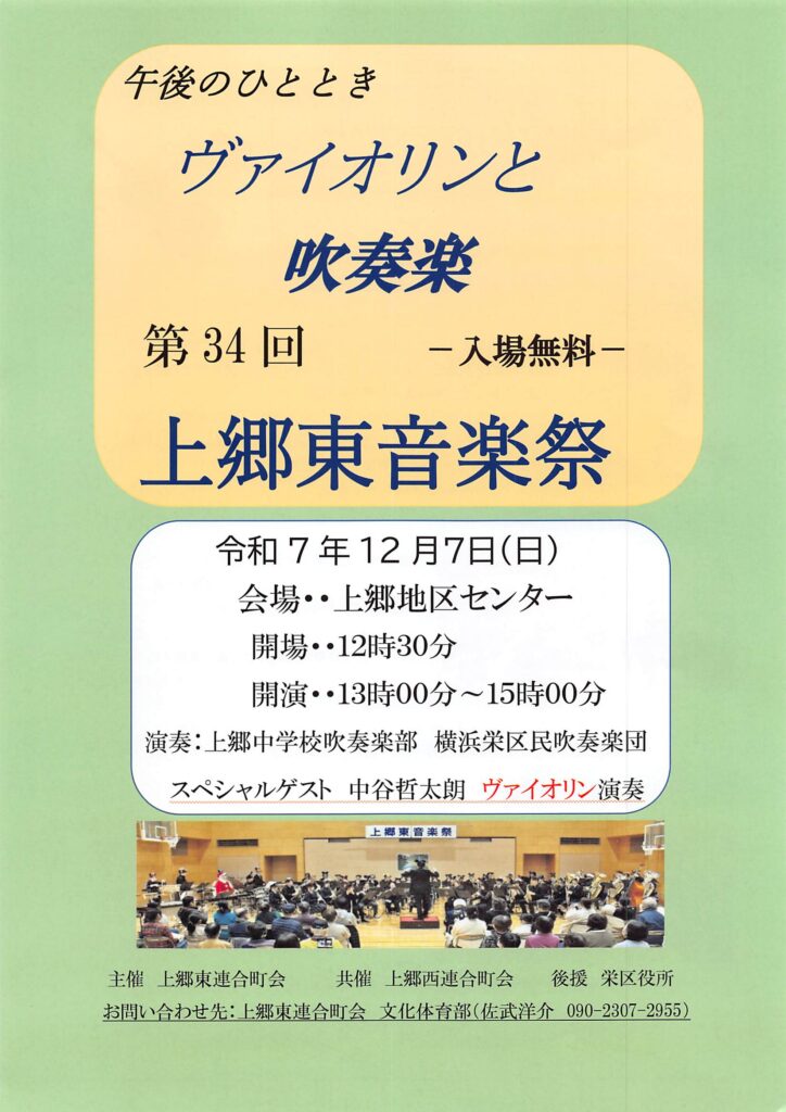 第34回上郷東音楽祭を令和7年12月7日13時から上郷地区センターで行います。