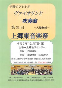 第34回上郷東音楽祭を令和7年12月7日13時から上郷地区センターで行います。今年度も上郷中学校吹奏楽部、および栄区吹奏楽団による演奏を行います。さらに、特別出演として、新進気鋭のバイオリニスト中谷哲太朗さんに演奏してい […]